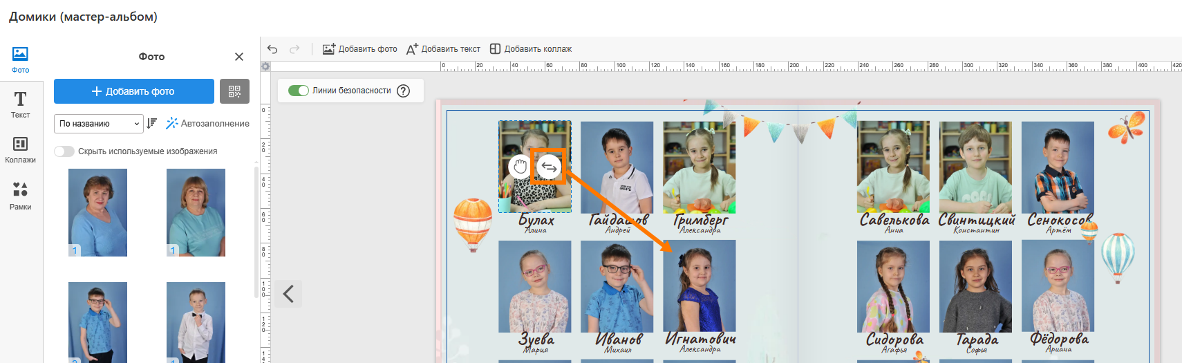 Открыть мастер-альбом и поменять местами педагогов путем перетаскивания одной фотографии на другую.