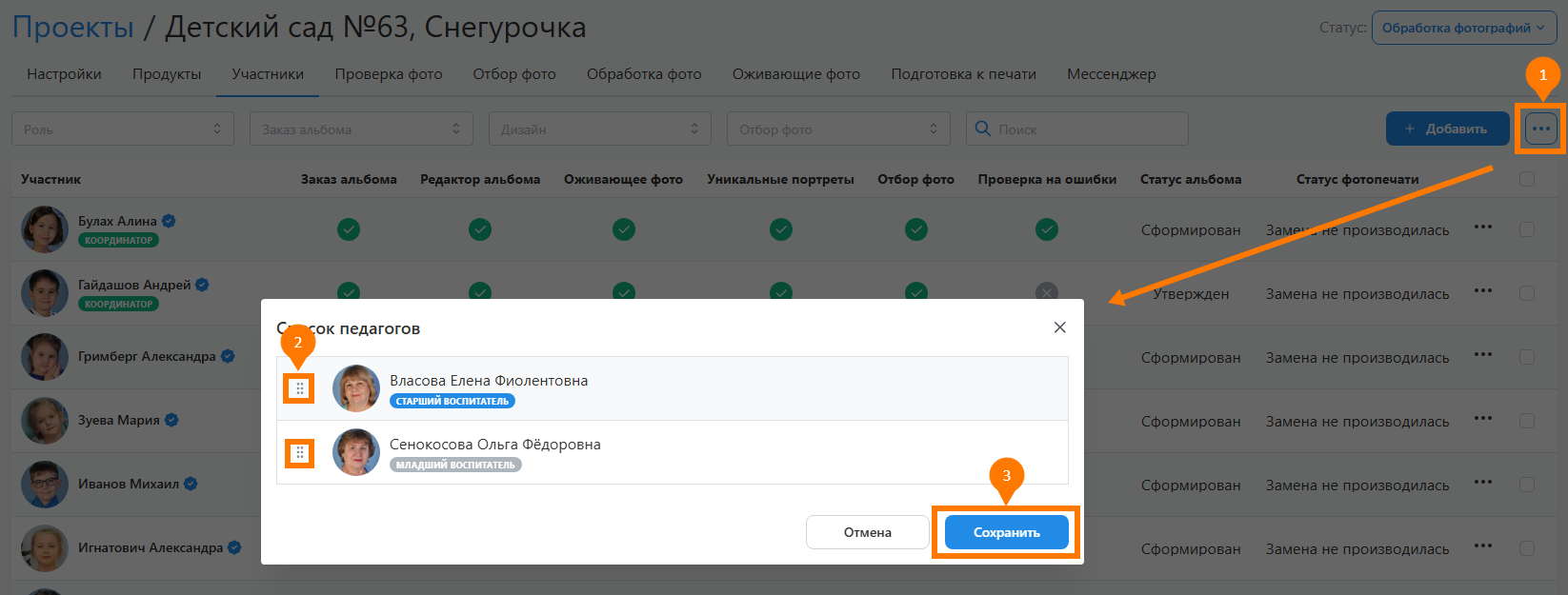 В разделе "Участники" нажать кнопку "три точки" и выбрать действие "Задать порядок педагогов". В открывшемся окне установить необходимый порядок и запустить генерацию альбомов заново.
