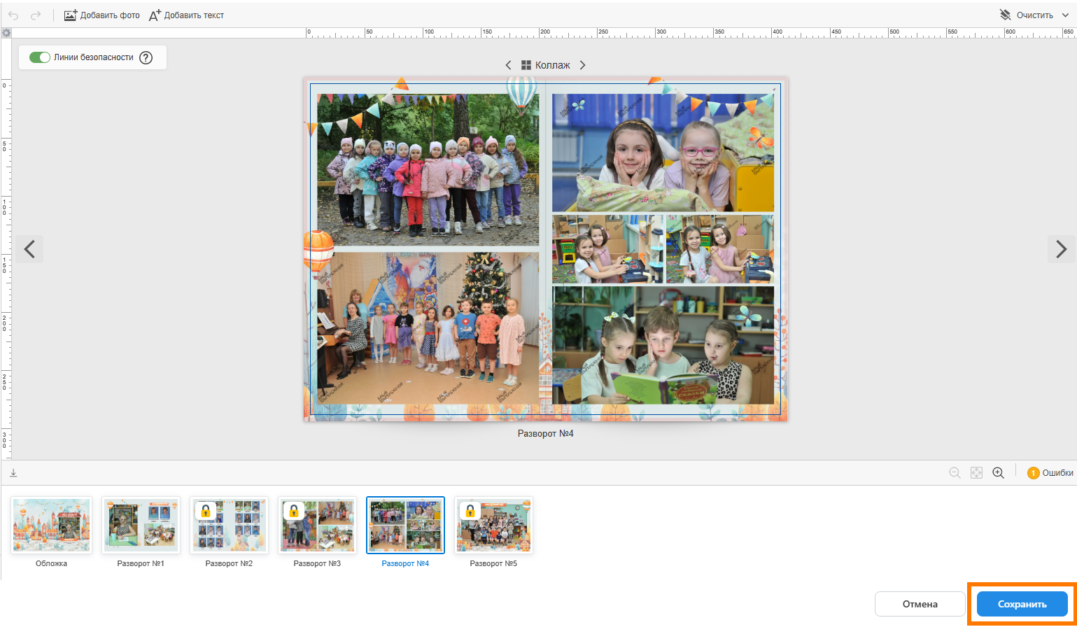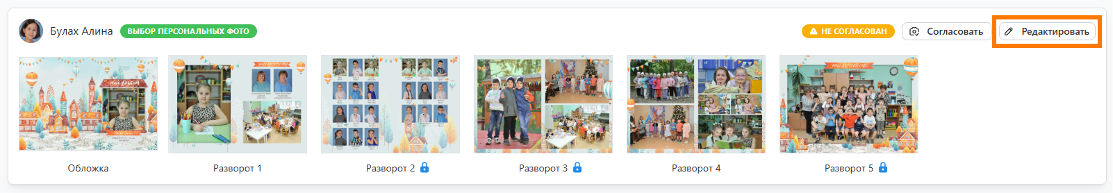 - В открывшемся окне внести правки в дизайн персональных разворотов (без замочка). Например, вы можете поменять раскладки и набор фотографий. А по завершению работы нажать кнопку “Сохранить”.