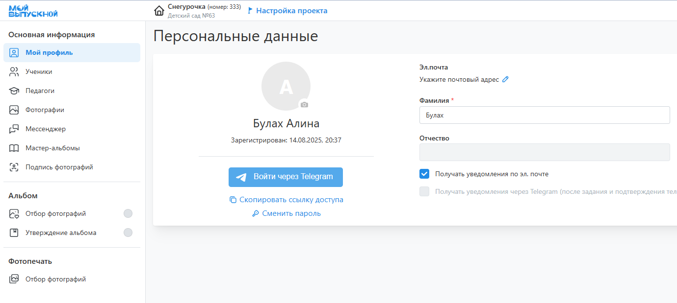 - “Мессенджер” - для коммуникации с фотографов (например, по вопросам ретуши фотографий).