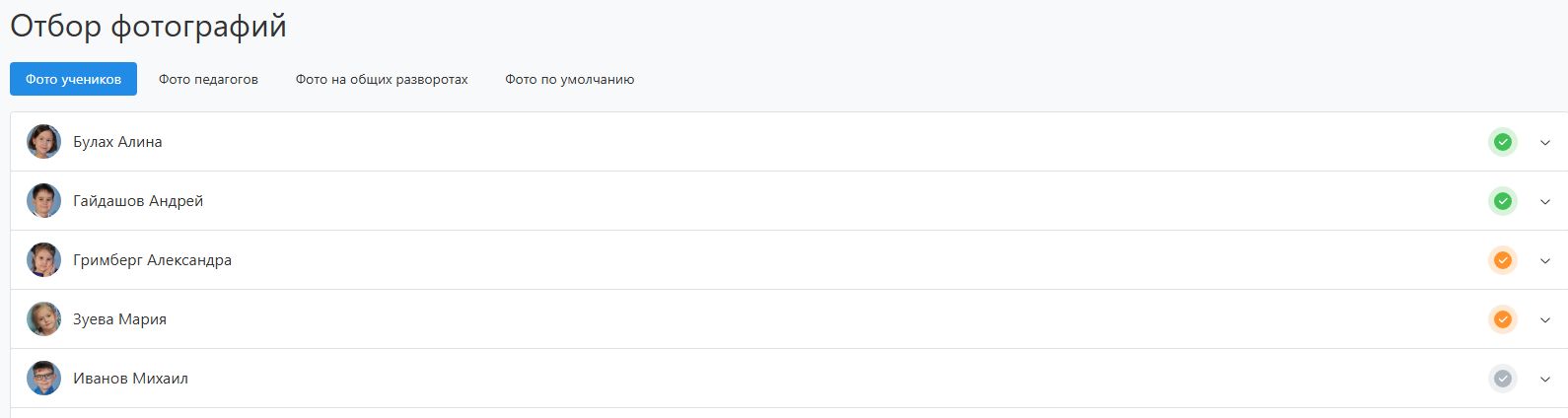 - Выбираемые общие фотографии во вкладке "Фото по умолчанию" копируются всем участникам. Однако этот выбор может быть изменен. Данный подход упрощает процесс отбора, т.к. групповые фотографии зачастую у всех одинаковые.