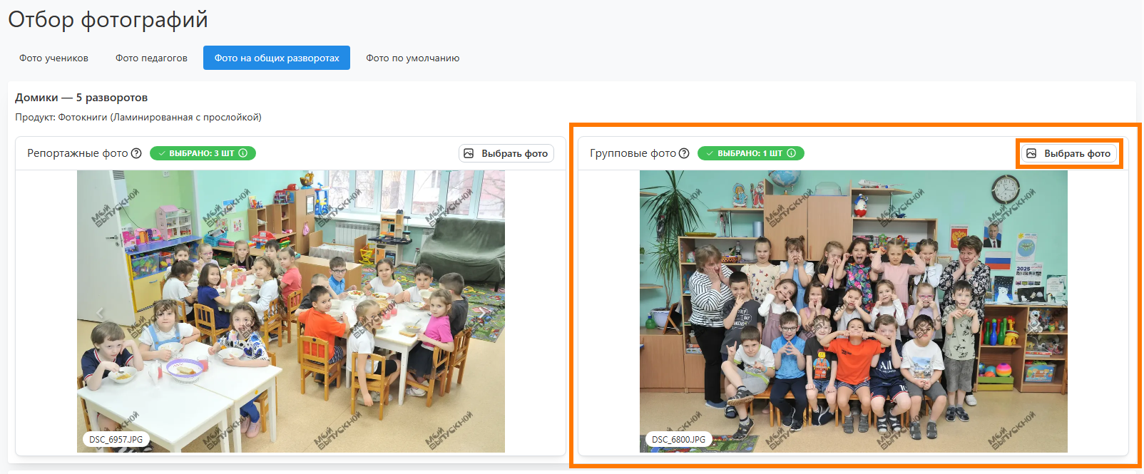 - Фото на общих разворотах - это репортажные и групповые снимки для общих разворотов. Вкладка будет отсутствовать, если в дизайне все развороты персональные.