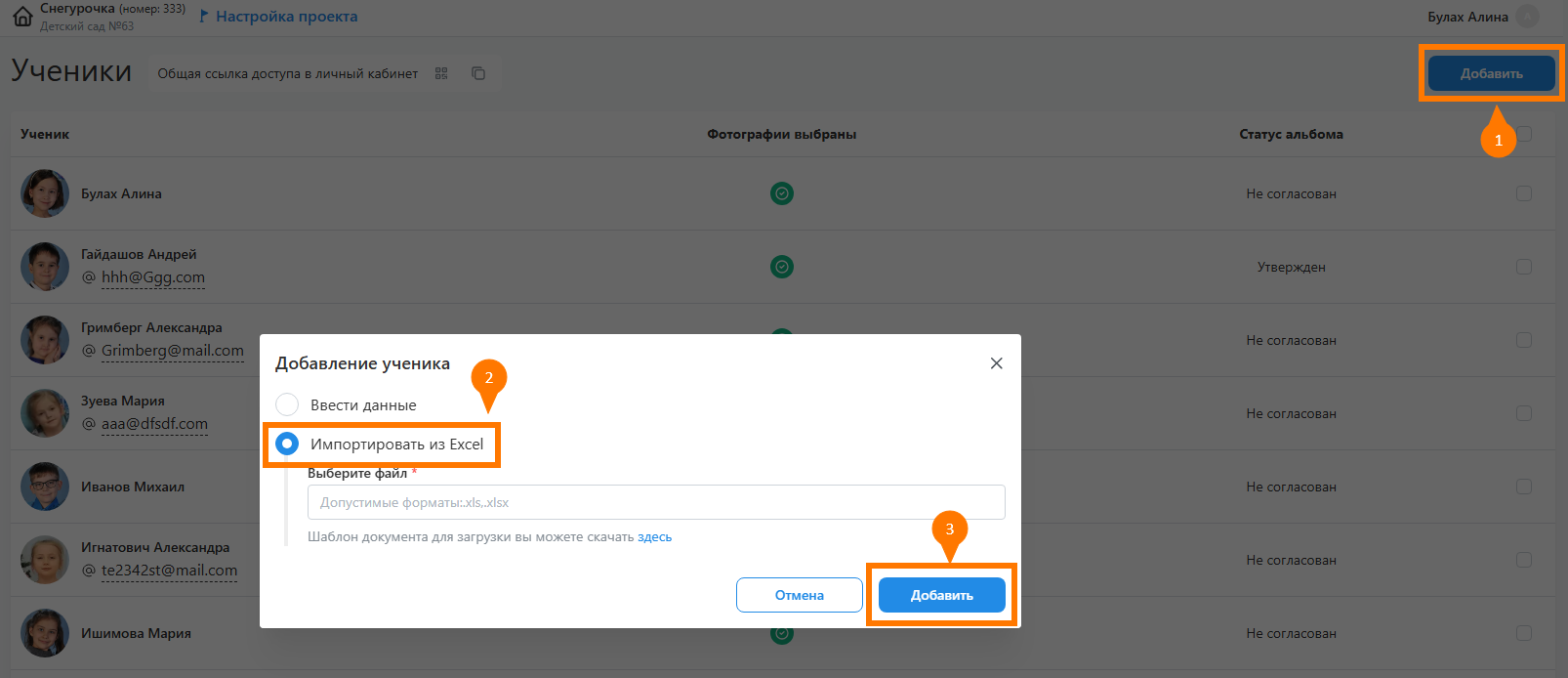 - Для удобства работы можно предварительно загрузить в сервис список учеников в excel-файле. Для этого необходимо: