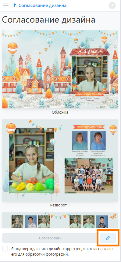 - Далее потребуется согласовать дизайна нажатием кнопки "Утвердить".