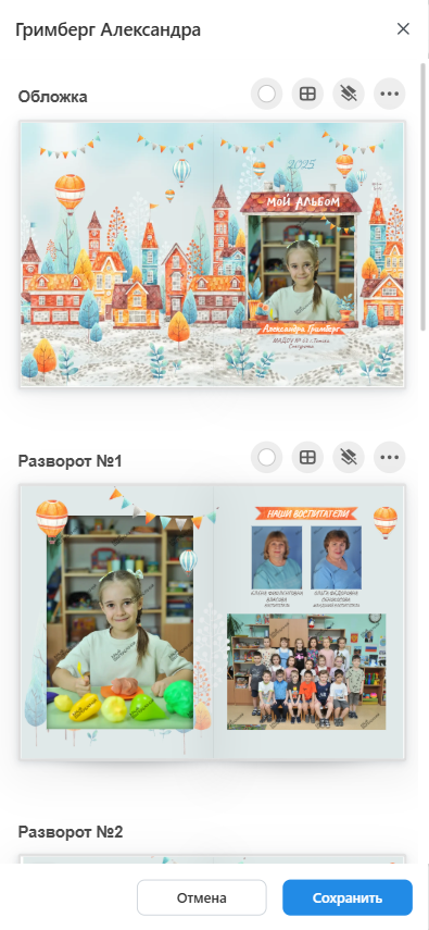 - В открывшемся окне внести правки в дизайн персональных разворотов (без замочка). Например, вы можете поменять раскладки и набор фотографий. А по завершению работы нажать кнопку “Сохранить”.