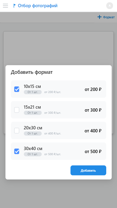 - На первом этапе необходимо выбрать форматы отпечатков.