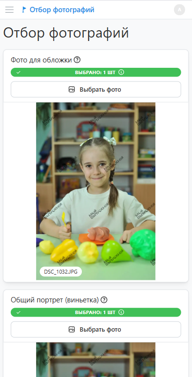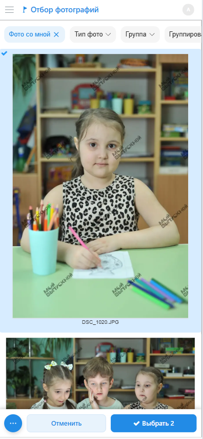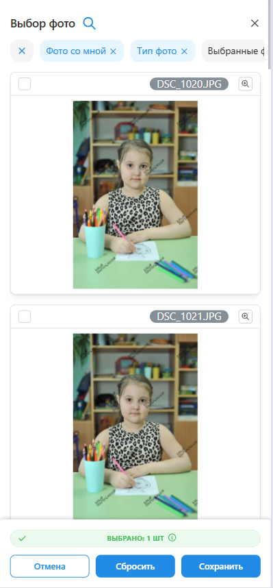 - Выбор фотографий для соответствующего блока осуществляется в модальном окне по нажатию кнопки "Выбрать фото". В верхней части окна представлен фильтр, которым удобно пользоваться для групировки или фильтрации снимков.