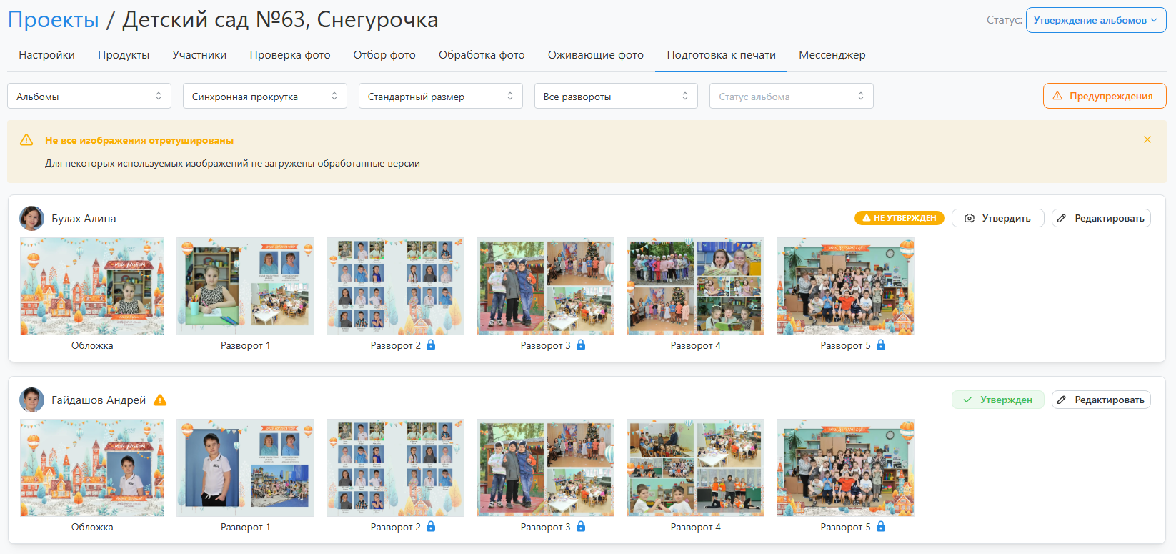 В сервисе предусмотрен автоматический перевод проекта в этот статус после утверждения последнего альбома. Саму проверку можно осуществлять либо в профиле каждого ученика, либо в разделе "Подготовка к печати".