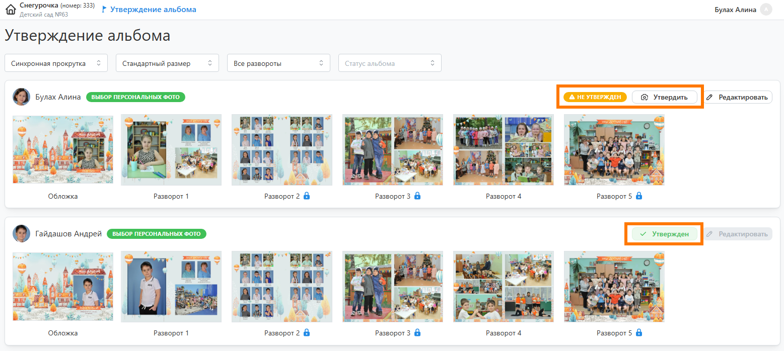 Следующим этапом работы после обработки фотографий является "Утверждение альбомов", которое осуществляется через личный кабинет. Ученики могут проверять и утверждать только персональные альбомы, а координатор - как общий, так и персональные других учеников.