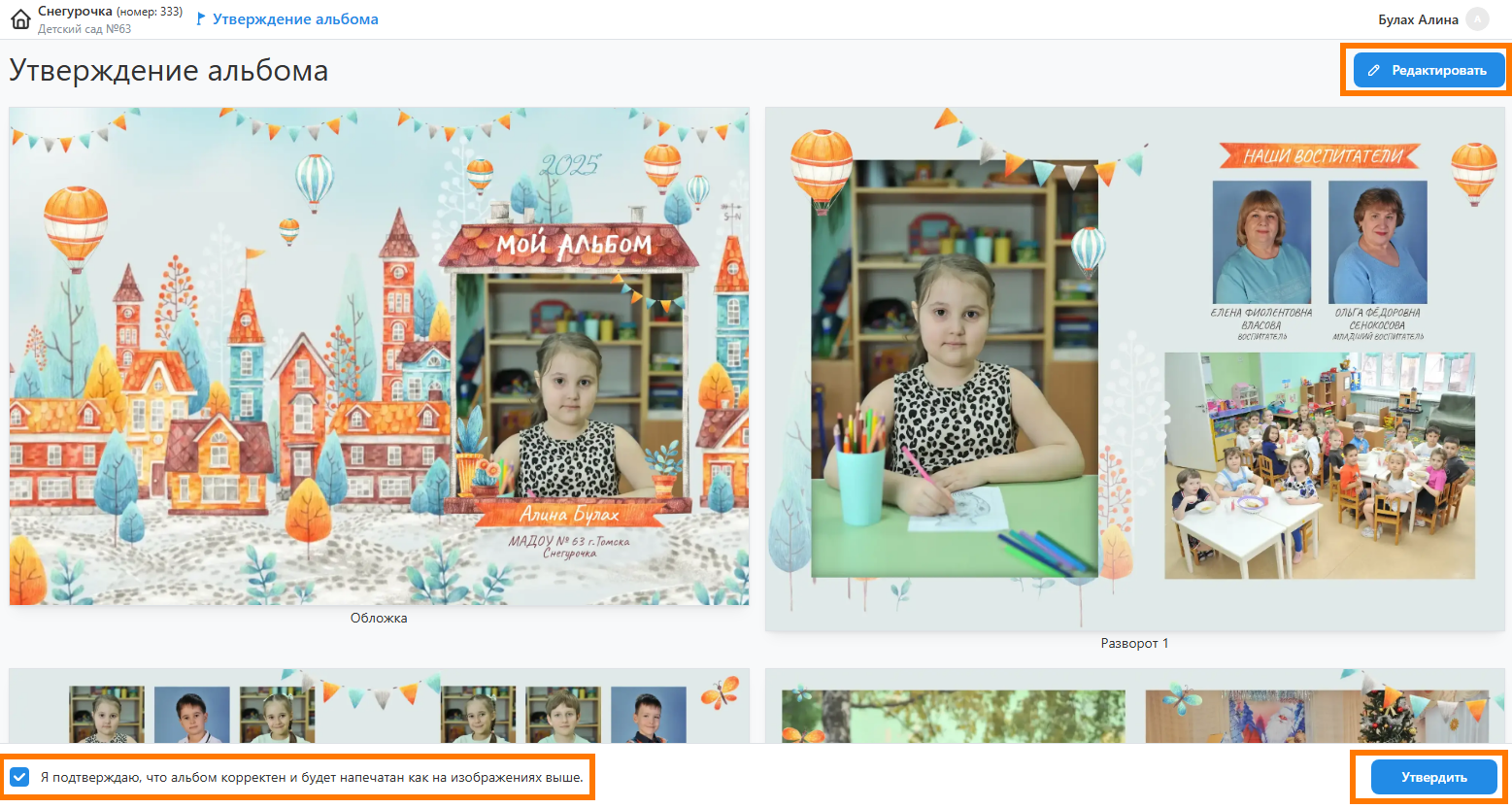 У каждого ученика в личном кабинете в разделе "Утверждение альбома" отображается готовый для печати макет альбома. Если по нему нет замечаний, необходимо подтвердить корректность альбома и нажать кнопку “Утвердить”.