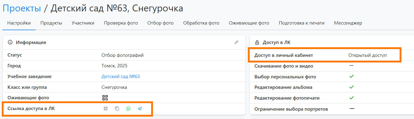 - Данный блок содержит настройки доступных функций в личном кабинете. Часть из них инициализируются значениями из раздела "Настройка / Доступ в личный кабинет". Описание всех параметров есть в статье Общие настройки.