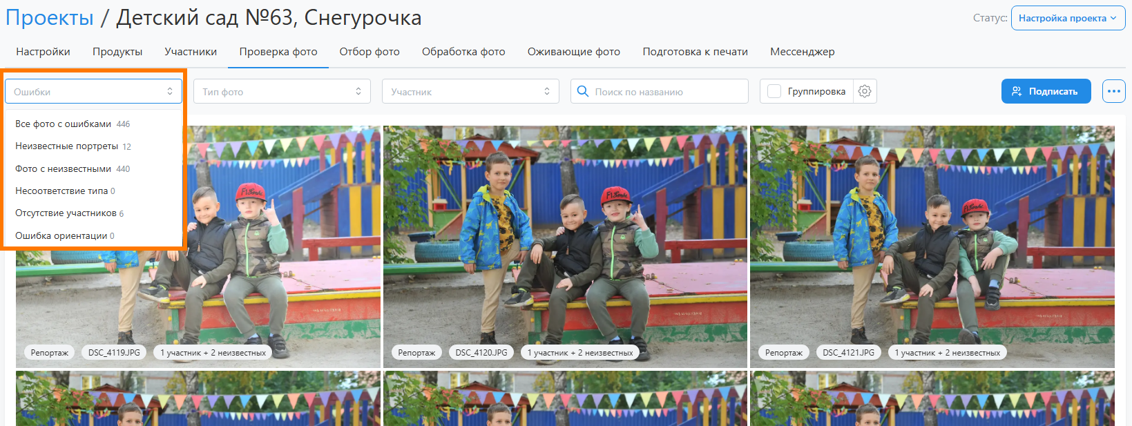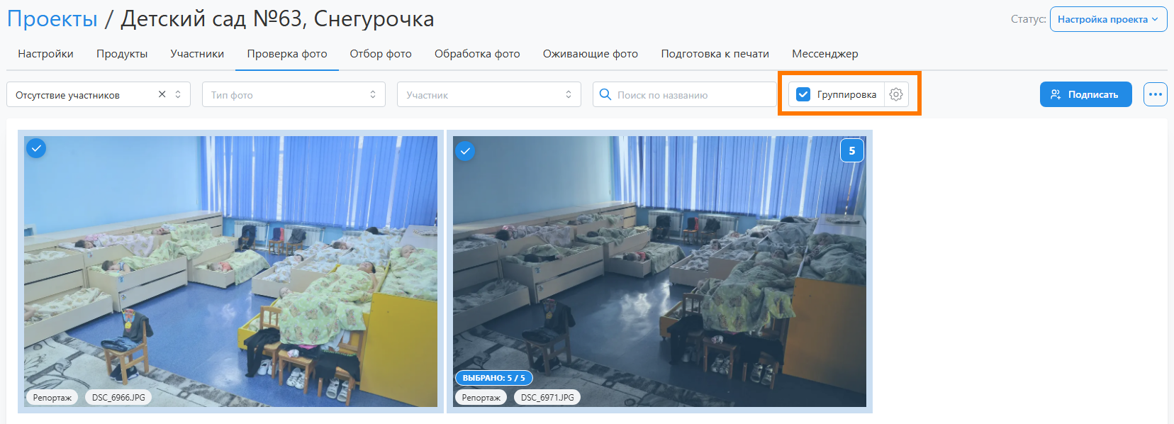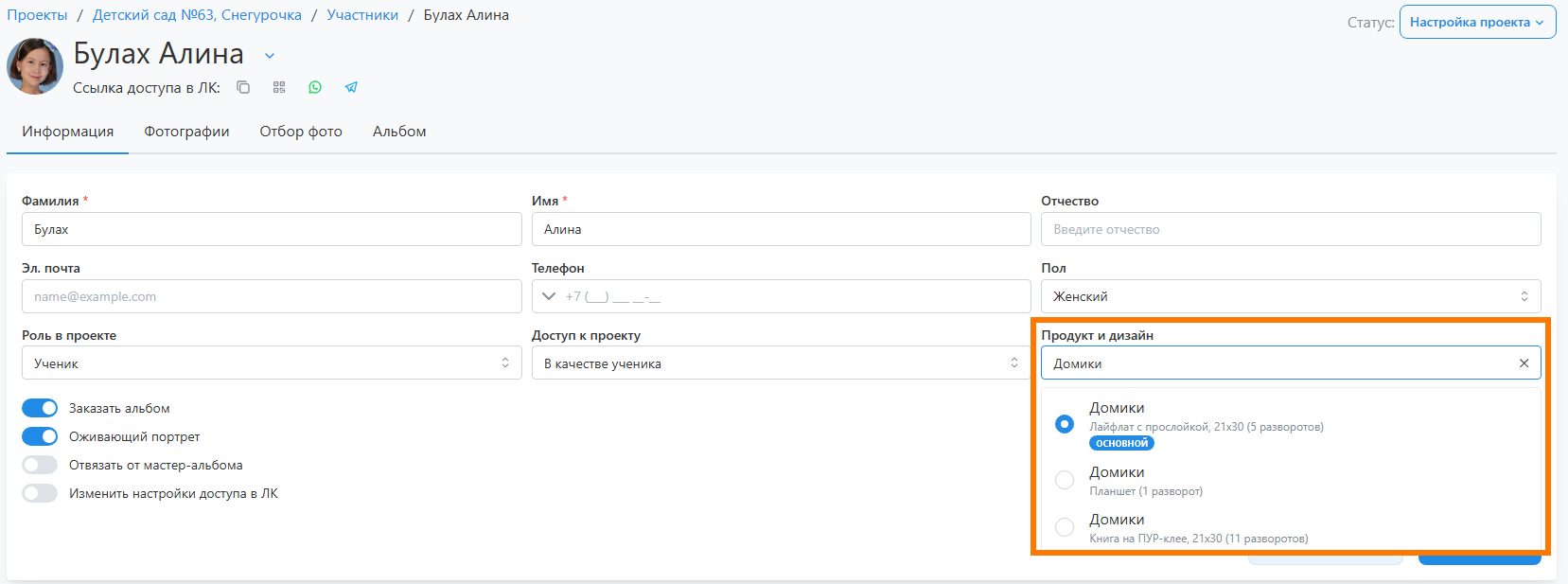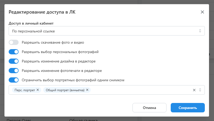 - Единственной настройкой, значение которой задется только на уровне проекта, является ограничение выбора портретов. Она разрешает для перечисленных портретных рамок выбирать лишь одну фотографию.