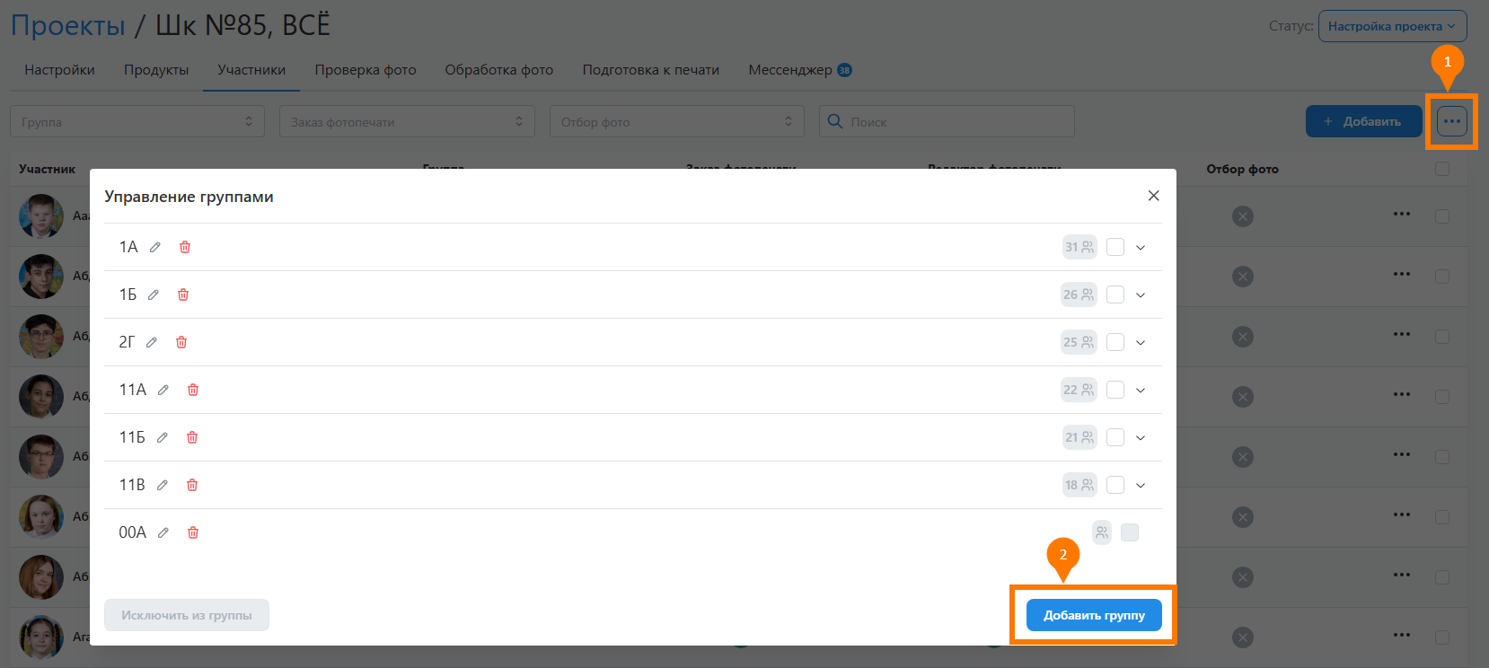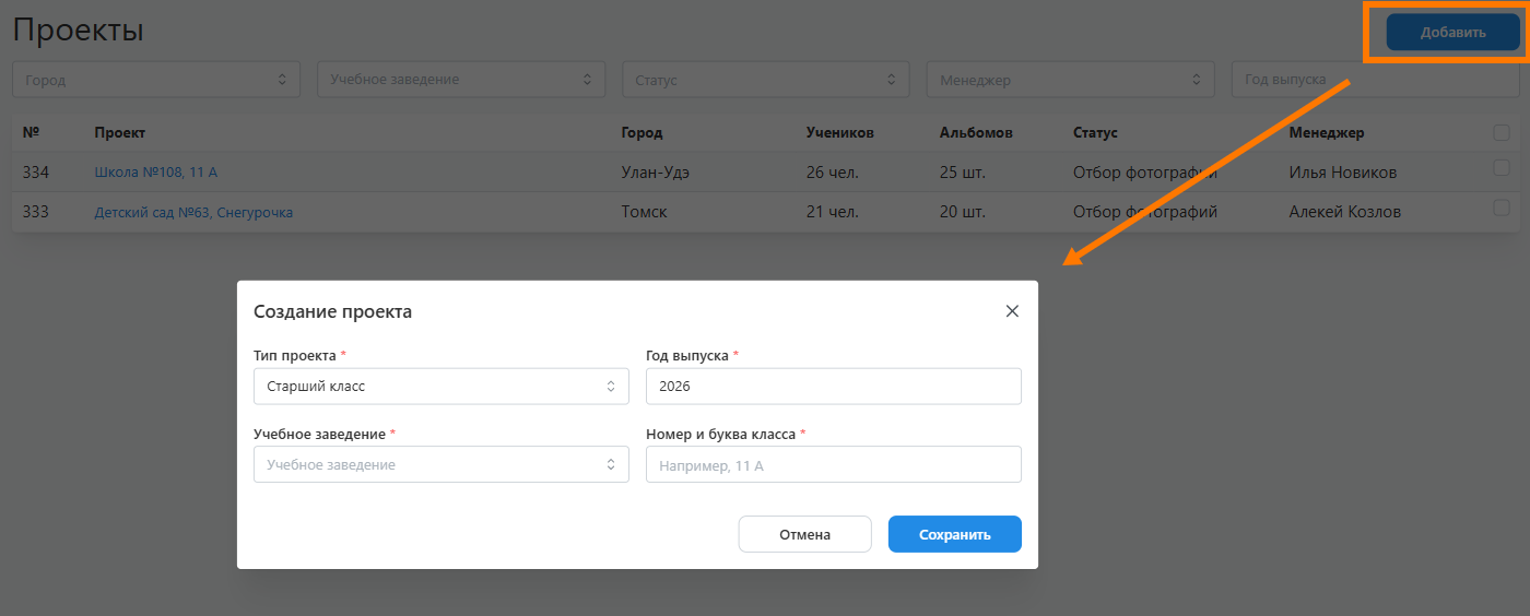 - Для создания проекта необходимо перейти в раздел "Проекты" и нажать кнопку "Добавить". В открывшемся модальном окне задать основные его параметры: