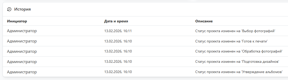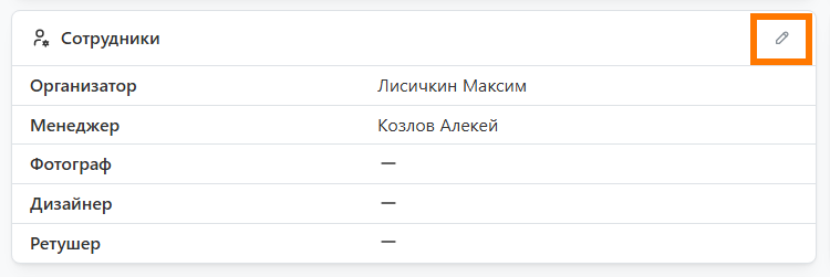 - Данный блок содержит список сотрудников с соответствующими ролями, каждому из которых будет отправляться уведомление при назначении на проект или смене статуса.