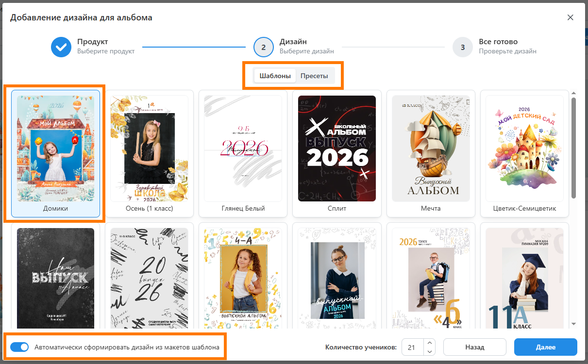 - Тип проекта - определяет возрастную группу учеников.