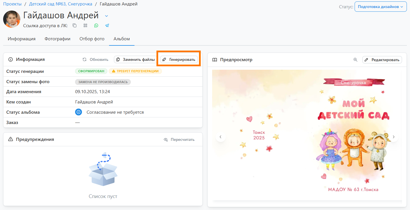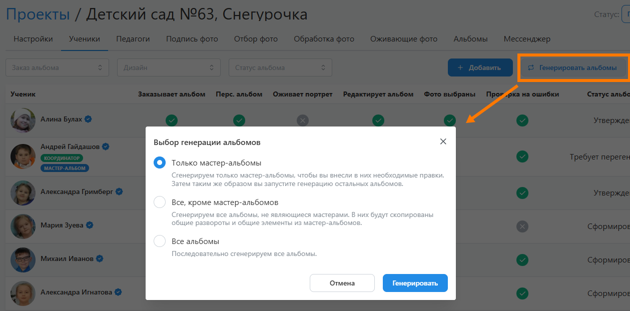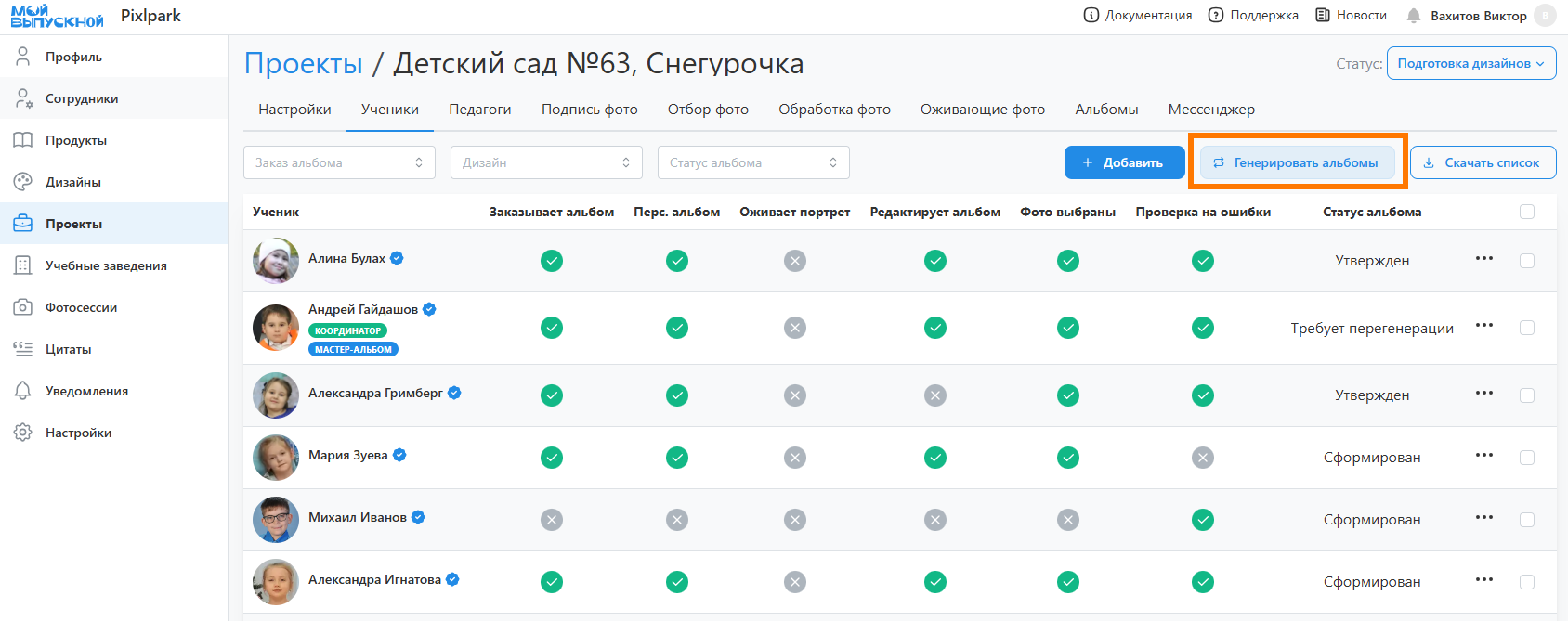 - Следующий этап после отбора фотографий - это "Подготовка дизайнов". Генерация альбомов запускается только в ручном режиме, чтобы перед этим можно было еще раз проверить выбранные фотографии учеников.