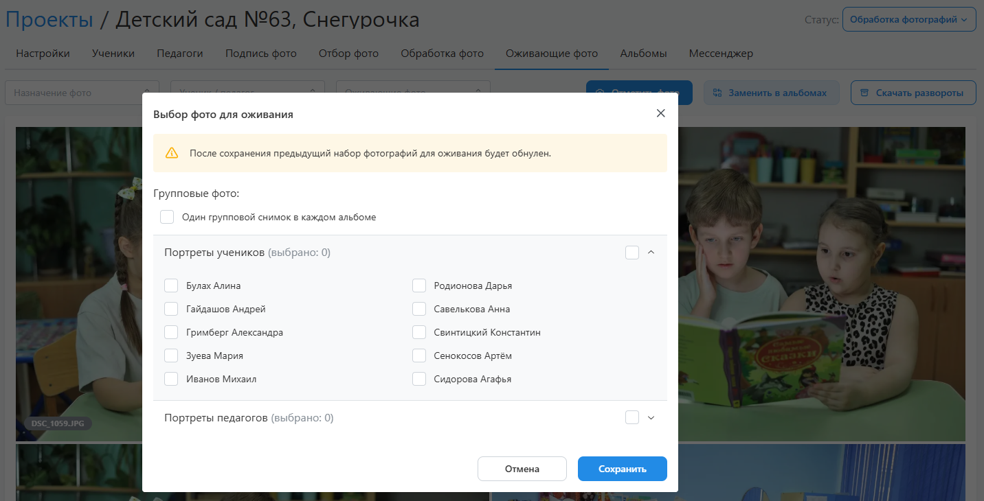 Она позволяет автоматически выбрать по одному портретному снимку каждого ученика/педагога и одну групповую фотографию.