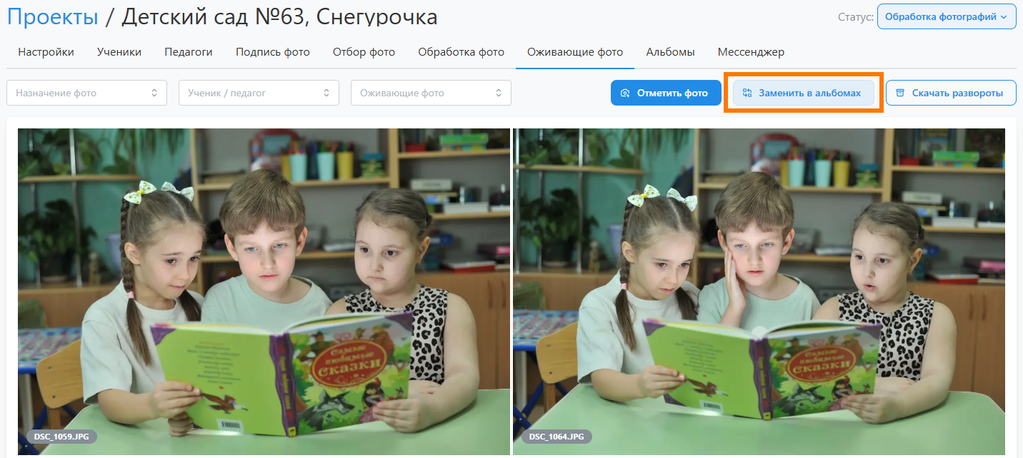 - После завершения выбора фотографий необходимо нажать кнопку “Заменить в альбомах”.
