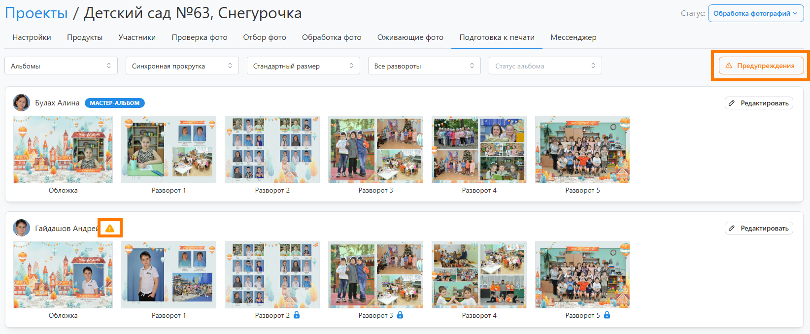 - После изменение используемых раскладок мы рекомендуем проверить корректность альбомов через раздел "Подготовка к печати". Встроенный механизм проверки на ошибки (кнопка "Педупреждения") сообщит, если на какой-то фотографии голова вышла за пределы зоны видимости.