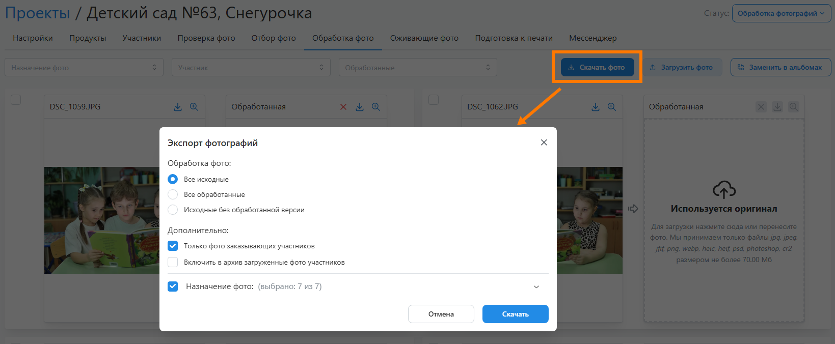 - Перейти в раздел "Обработка фото" и нажать кнопку "Скачать фото".