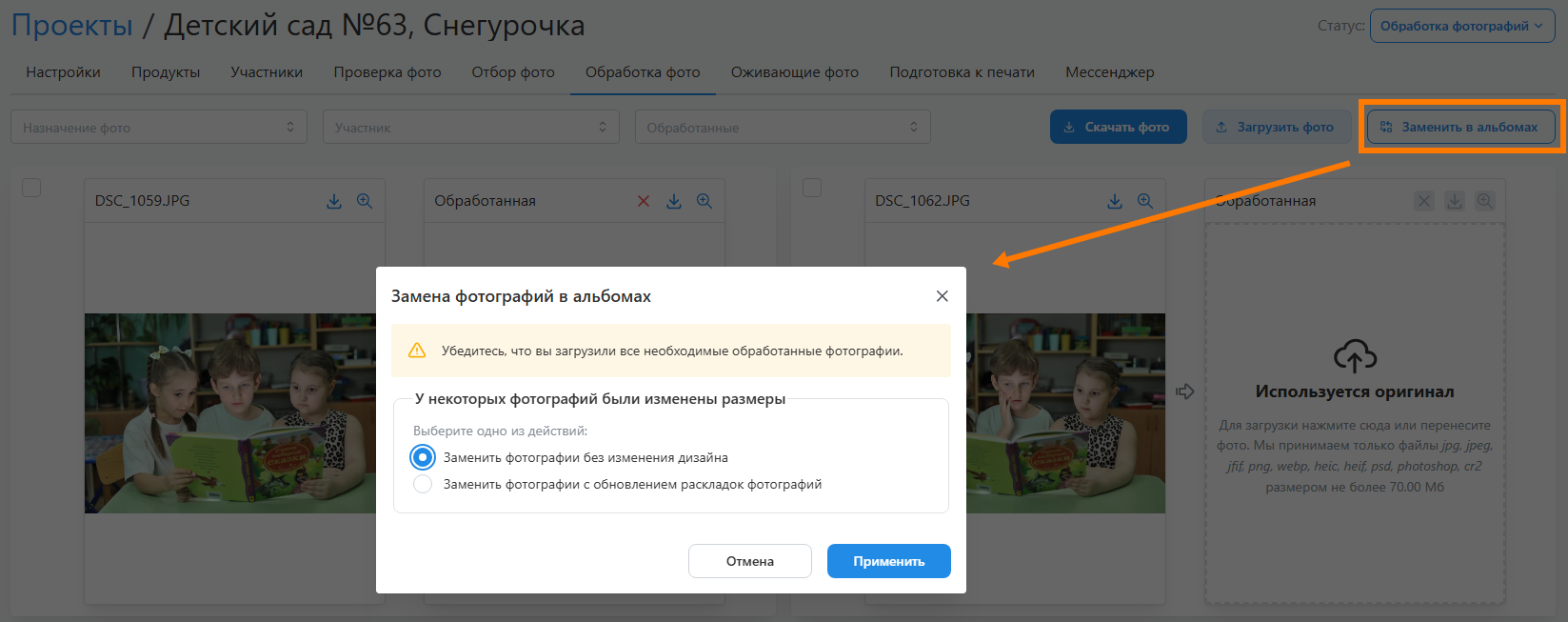 - После загрузки фотографий необходимо нажать кнопку "Заменить в альбомах". Если пропорция обработанных снимков была изменена более чем на 10%, то сервис предложит обновить используемые раскладки коллажей.