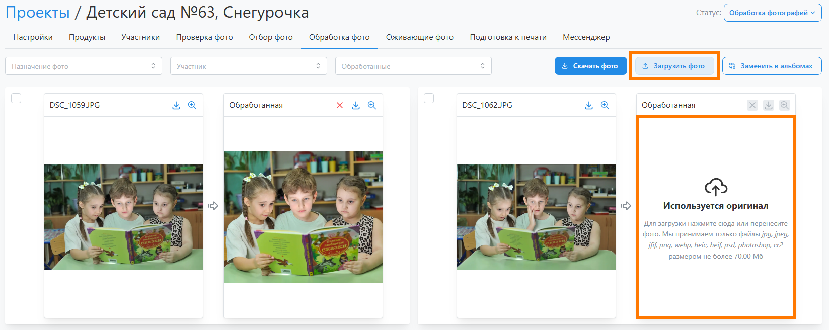 - После обработки файлов их необходимо загрузить обратно через кнопку “Загрузить фото”, не изменяя при этом их названия. Также допускается поштучное скачивание и замена снимков.