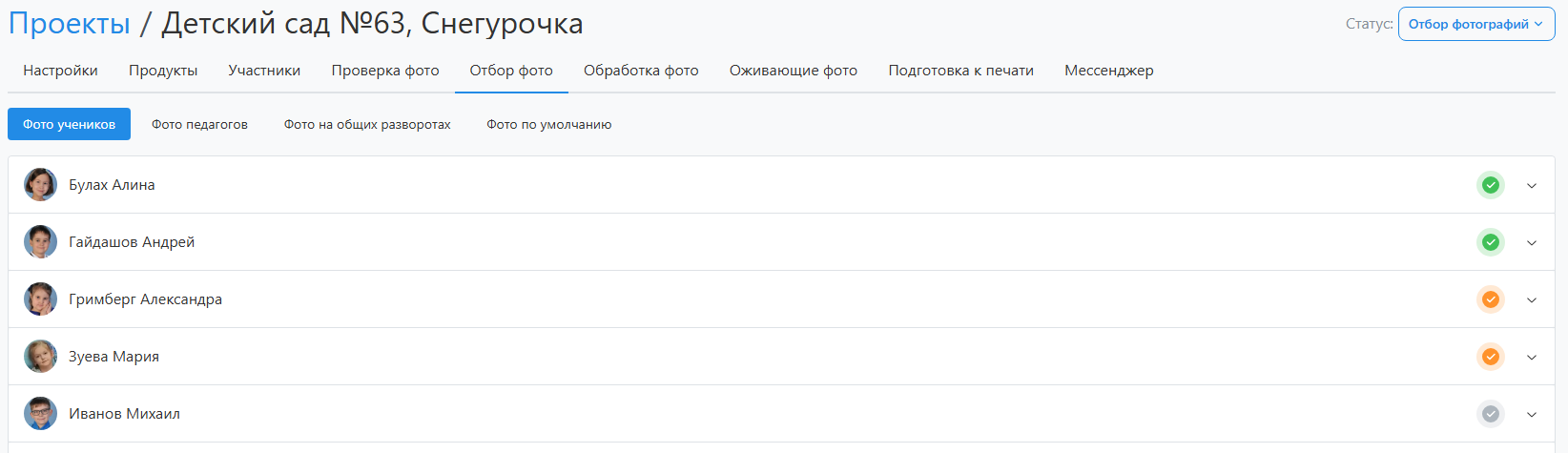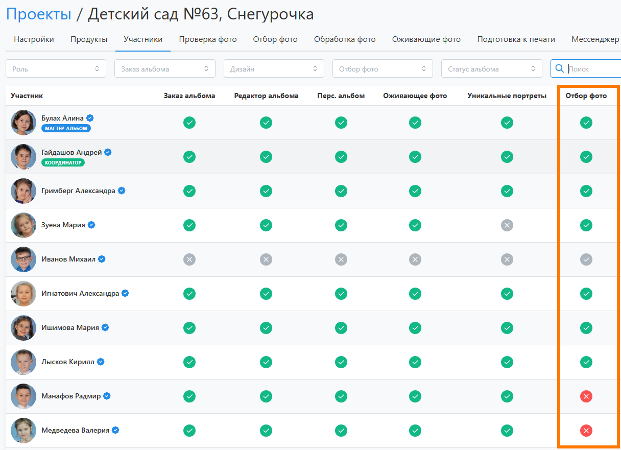 При формировании альбомов часто персональные фотографии выбирают сами ученики. Для отслеживания завершения отбора в сервисе предусмотрена цветовая индикация: отдельным столбцом в разделе "Участники" и напротив каждого участника в разделе "Отбор фото".