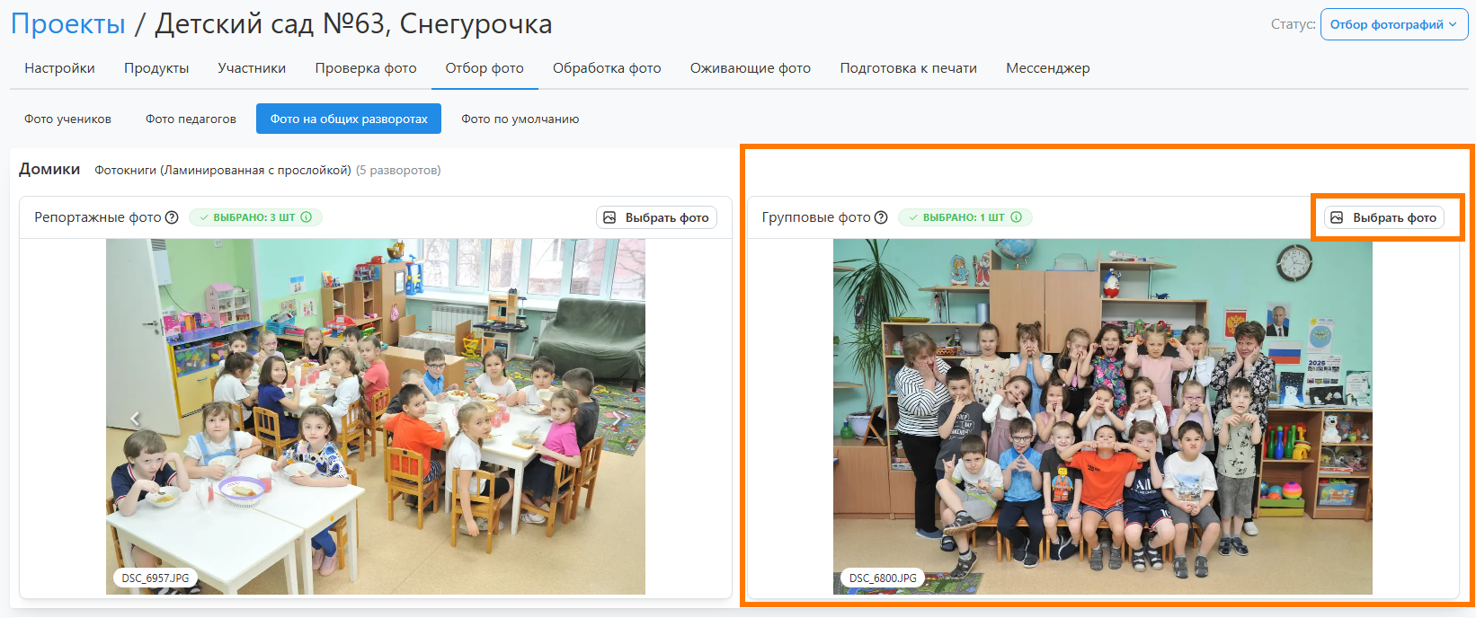 Фото на общих разворотах - это снимки для общих разворотов. Вкладка будет отсутствовать, если в дизайне все развороты персональные.