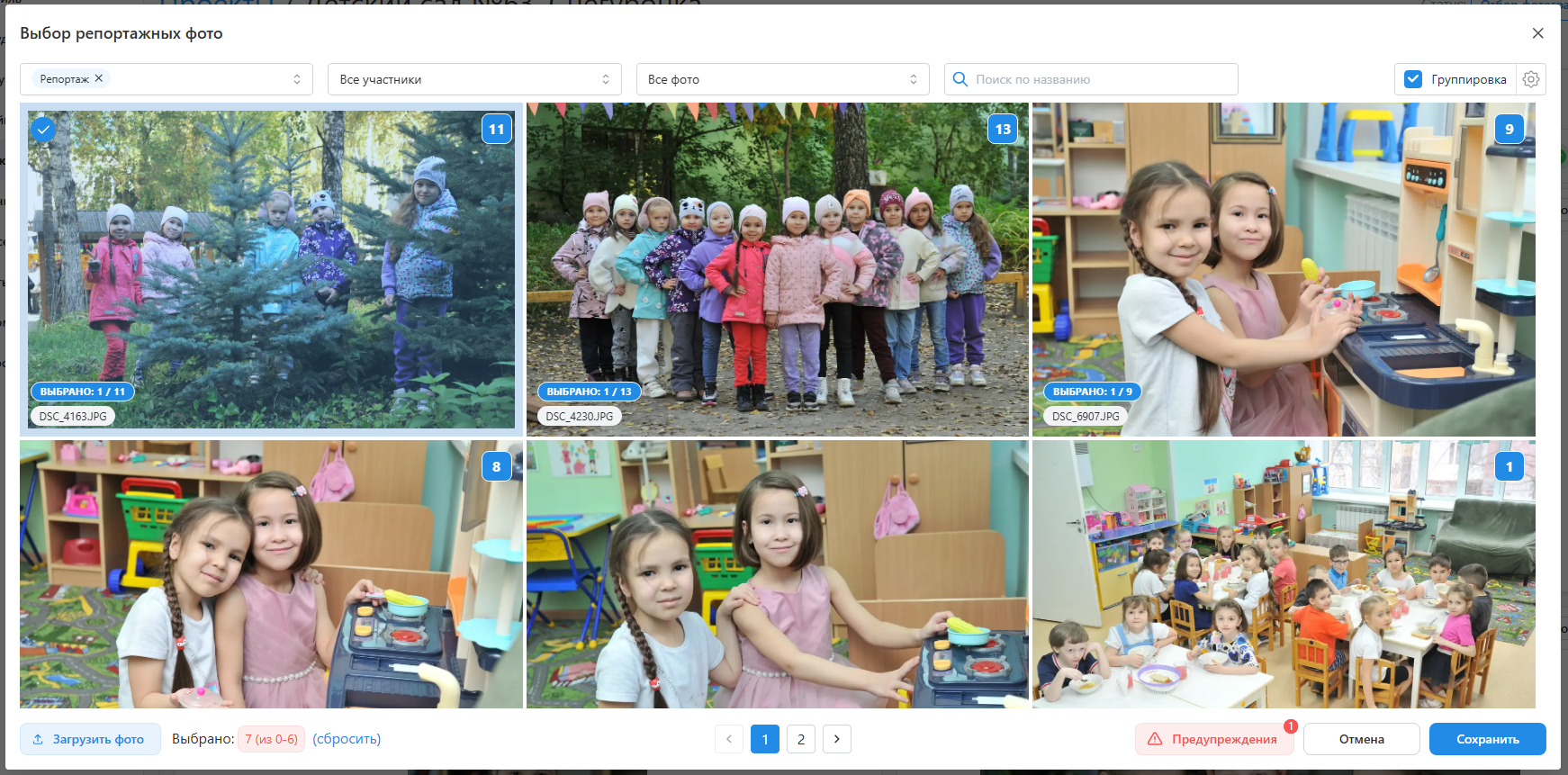 Набор необходимых фотографий определяется используемым дизайном. В панели управления работа по выбору фотографий ведется во вкладке "Отбор фото" или в профиле каждого участника.